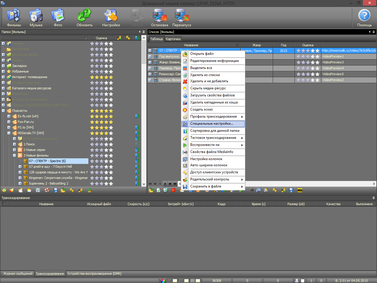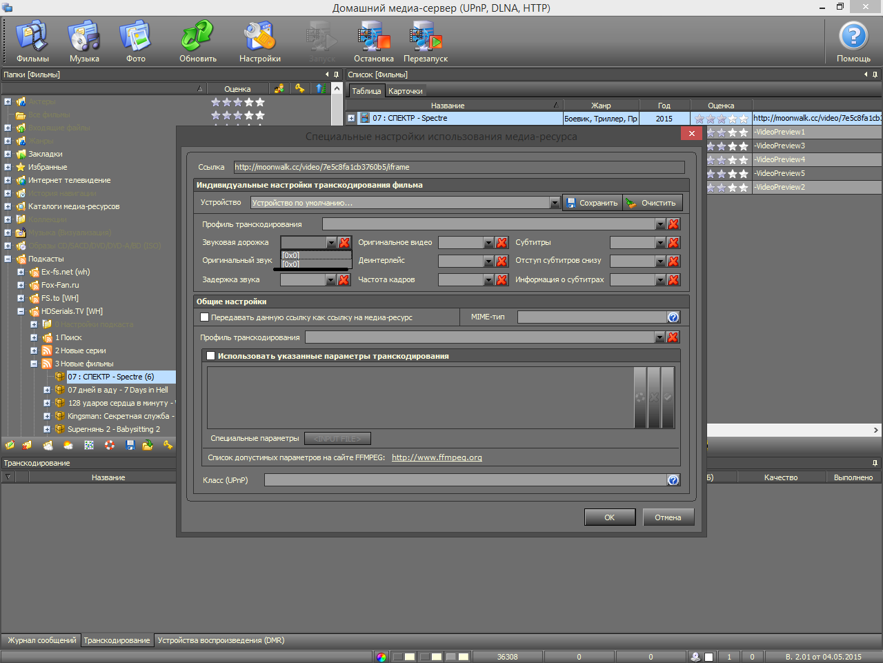 Настройки профиля транскодирования такие: Подкаст T-TV, "Спортивные каналы", Viasat Sport HD - Фильмы (оптимальный). MIME-тип: video/mpeg.