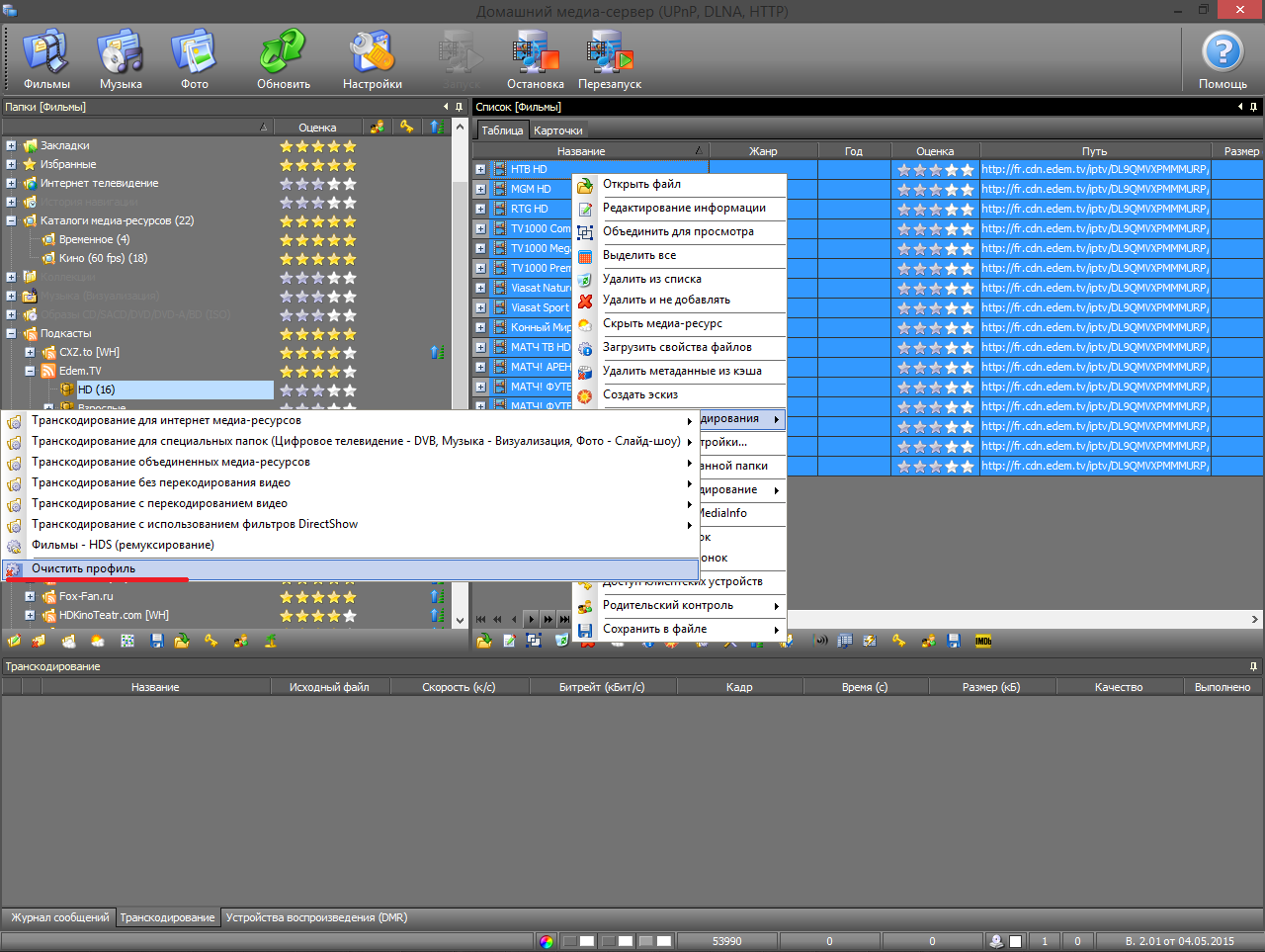 кстати профиль транскодирвоания для эдема у меня был выставлен изначально Наследовать, а в основных настрйоках программы в меню Транскодер - Профиль транскодирвоания - Фильм оптимальный.
