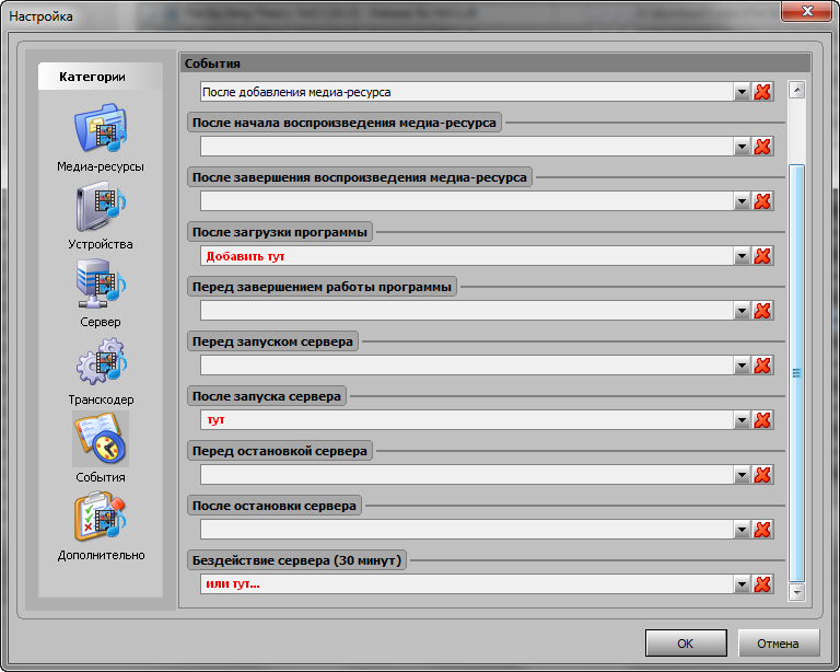 Далее переходите в раздел "События". Выбираете обработку для нужного события. Например "после запуска сервера" или "после добавления медиа-ресурса при сканировании".