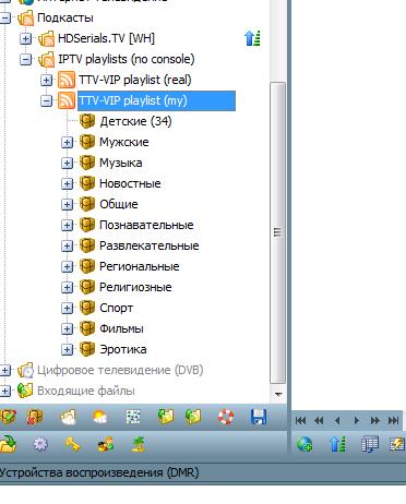 в пункт подкасты вставляем этот IPTV_playlists (предварительно распаковав). Там появится два пустых подкаста: TTV-VIP playlist (real) + allfontv. Нажимаем F2 на TTV-VIP playlist (real) и в строке Ссылка вписываем http://pomoyka.win/trash/ttv-list/ttv.all.player.m3u. В строке профиль транскодирования вписываем AceStream (Видео без изменения). Обновляем подкаст и вуаля! все категории по папкам распиханы. Если нужно, то конкретные каналы настраиваем руками.