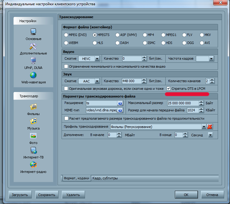 Вообще то Вы смотрели, что конкретно получается на выходе транскодера? В транскодере можно отключить использование кэша и файл будет складываться на диск, там можно посмотреть, что получается. Подозреваю, что все звуковые дорожки транскодируются в выбранный Вами формат, теперь надо на устройстве выбрать нужную дорожку. Кроме этого, если в параметрах устройства есть поддержка указанного формата и стоит опция не транскодировать, если формат поддерживается, то транскодирования вообще не будет. Попробуйте выяснить, какие форматы поддерживаются устройством и в индивидуальных настройках устройства в основных настройках оставить в поддержке файлов без транскодирования только поддерживаемые форматы. Вообще нужно внимательно посмотреть все настройки. Есть и тонкости, например, во многих профилях, при определённых условиях идёт применение другого профиля и так может быть последовательно несколько раз, это можно увидеть в скриптах профилей транскодирования.