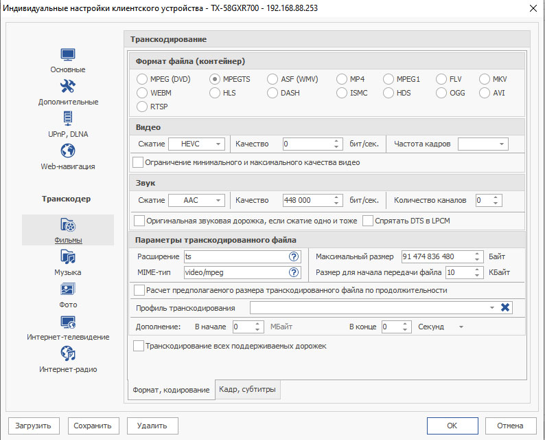Так он у вас всеядный судя по ТТХ, да еще 4К. Не знаю, на каком профиле вы остановились, но видимо, транскодирование не происходит. Он full HD нормально воспроизводит? Если флешку с проблемным кино воткнуть, как показывает?