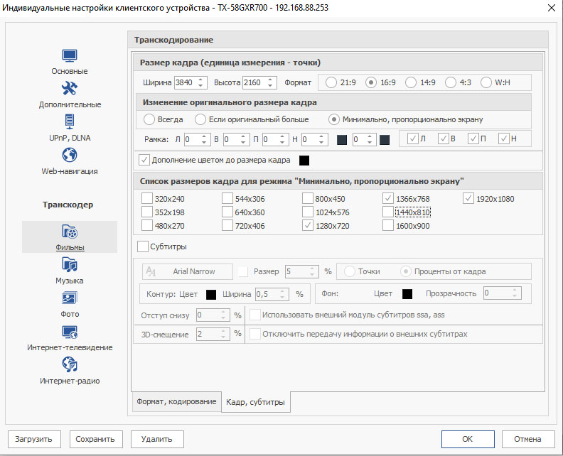 Ну что сказать. У вас установлена поддержка mkv без транскодирования. В самой таблице заявлена поддержка кодека H264. Значит этот фильм либо передается в ТВ без транскодирования, либо без перекодирования видеодорожки. Попробуйте в качестве эксперемента отключить поддержку mkv. И не используйте профиль "Фильмы (основной) + AR 16:9 CROP" для фильмов. Он для другого нужен. Его применяют для подкастов, в которых размеры кадра видео не удается получить до начала транскодирования, и вот для них принудительно выставляются необходимые пропорции в профиле.