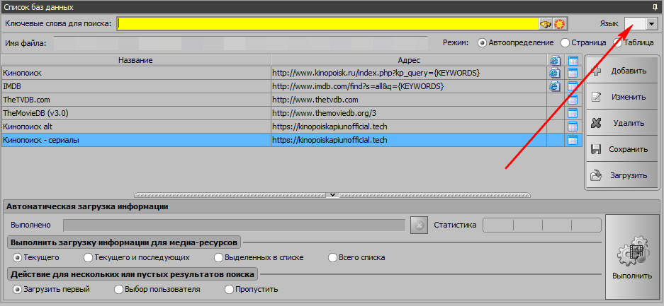 5. Нажать кнопку "Загрузить" в правой части "Списка баз данных". Перейти к папке, в которую распакован скрипт на шаге 2. Выбрать его. В перечне баз данных появится новая запись "Кинопоиск alt".