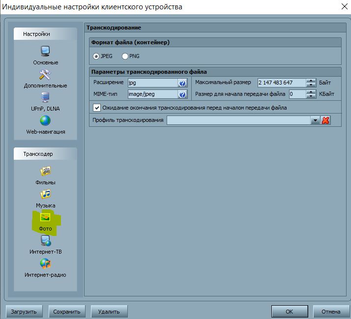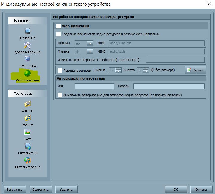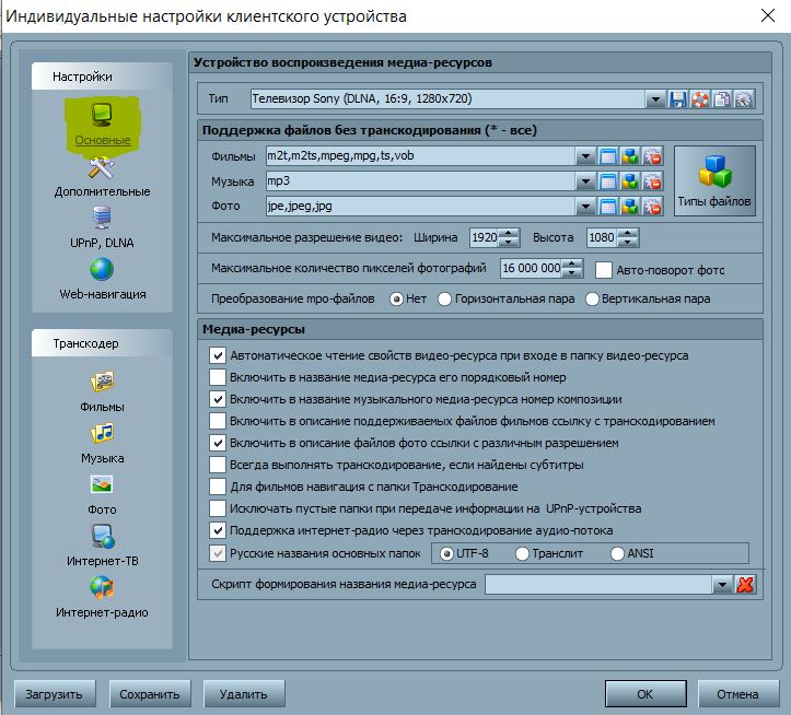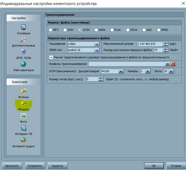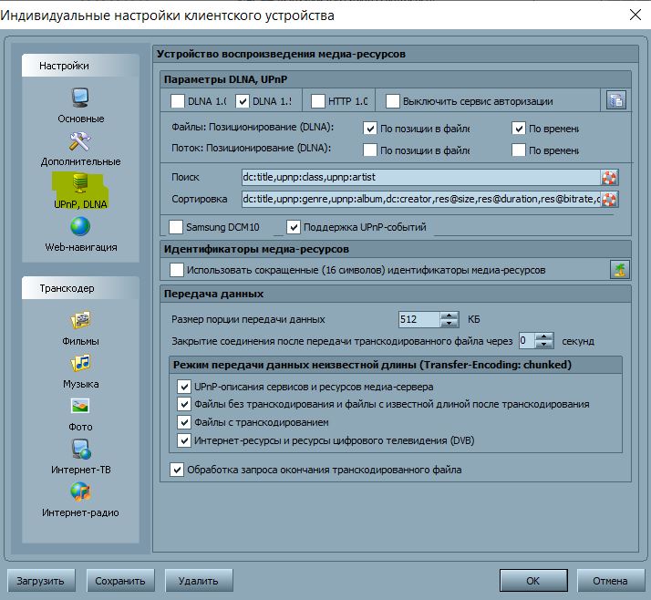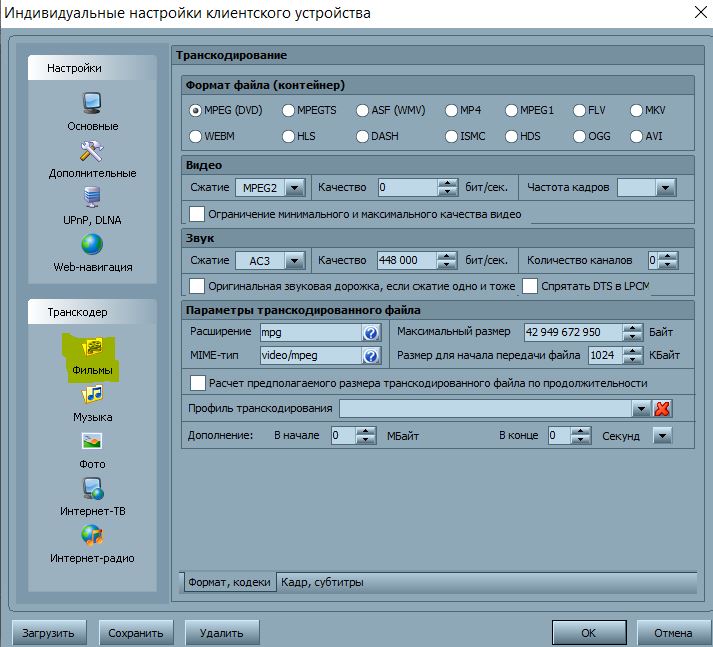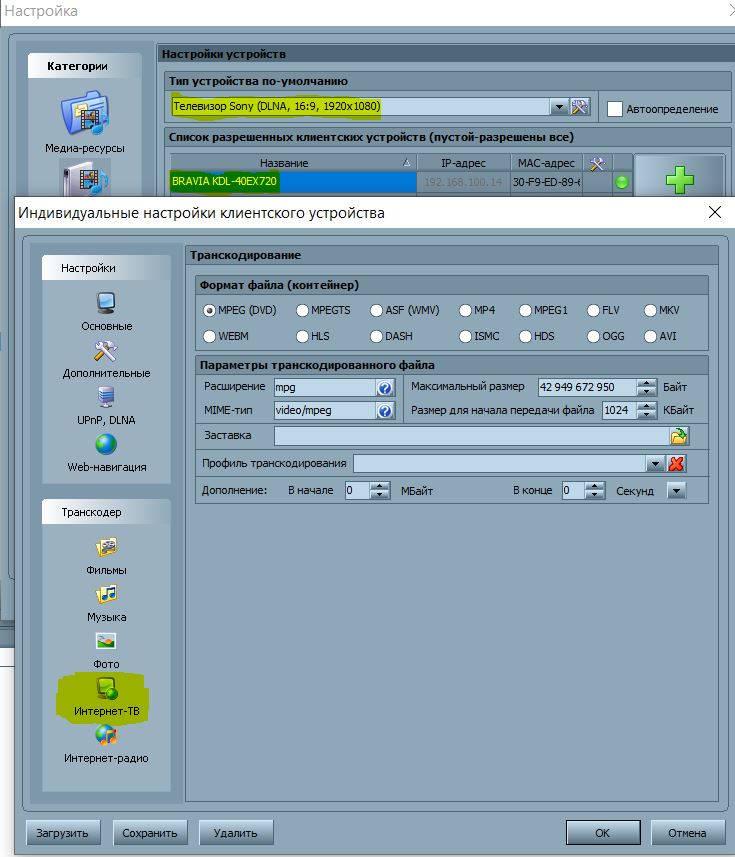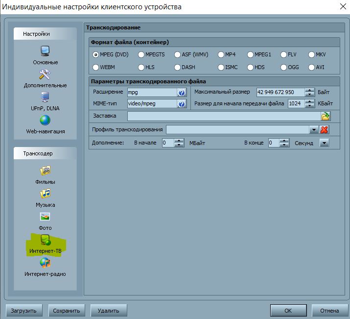 в третьих надо настраивать профиль транскодирования для устройства, а не общий, в устройстве для интернет ресурсов профиль отдельно настраивается (5 настроек, видео, музыка, фото, интерет-тв, интернет-радио).