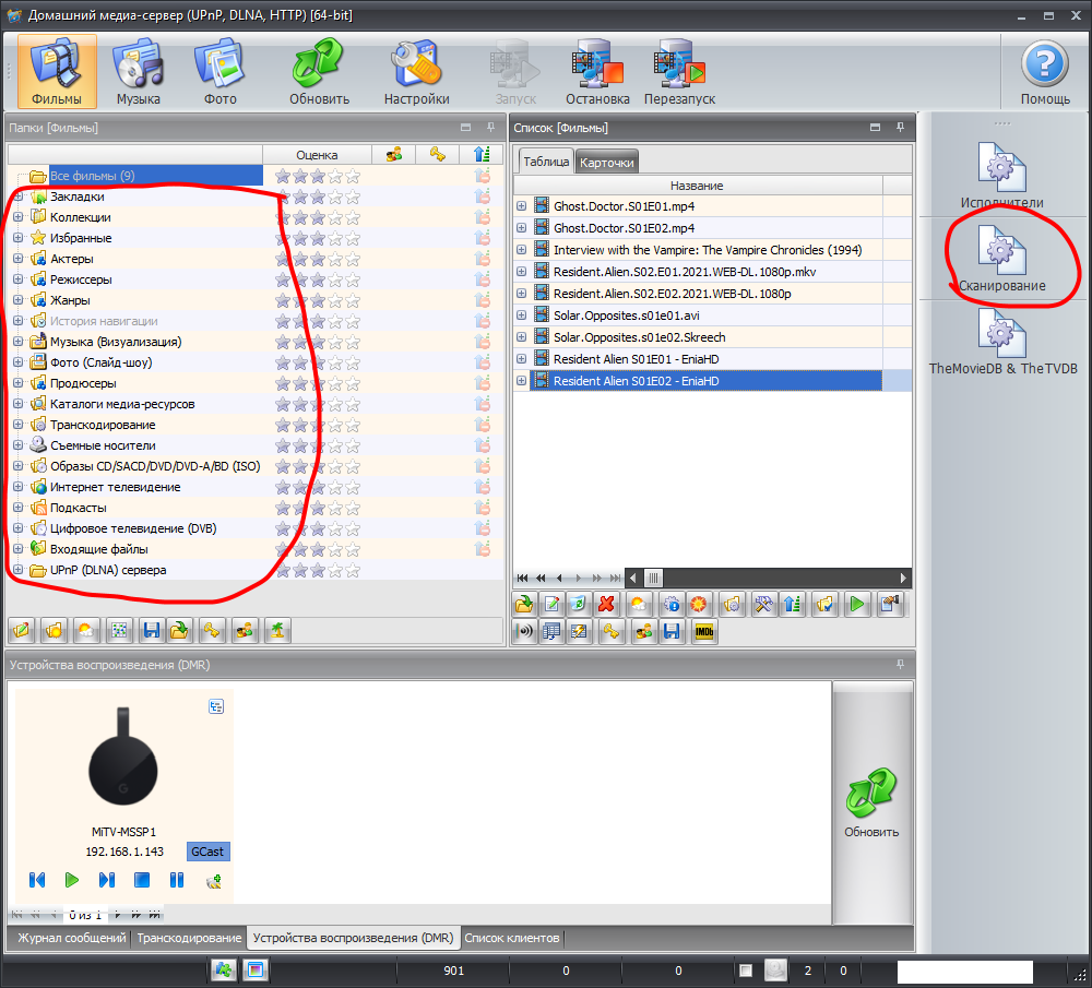 Благо автор вынес кнопку "сканировать" на переднюю панель, а то приходилось каждый раз тыкать на "настройки" - "сканировать" после каждого скачанного фильма