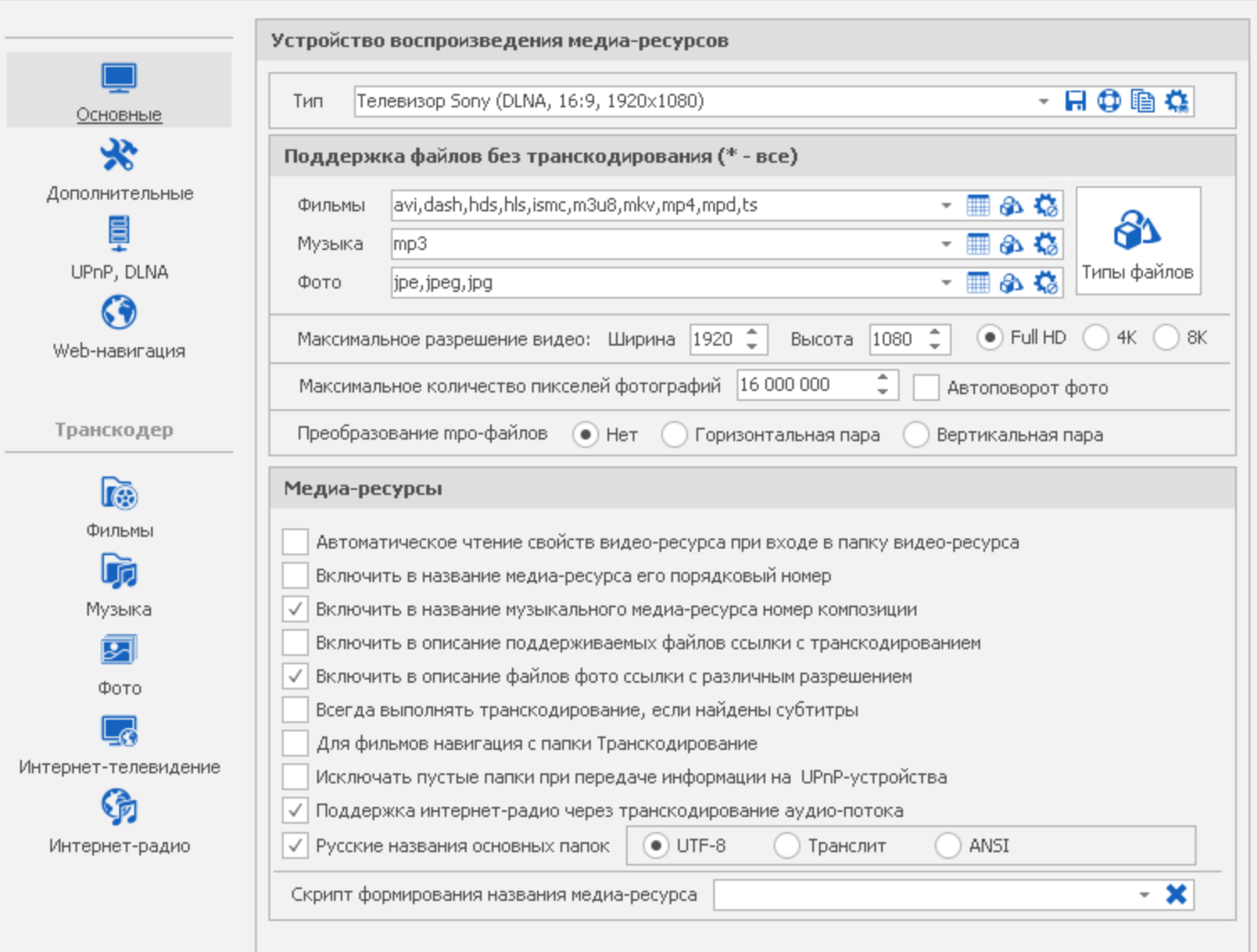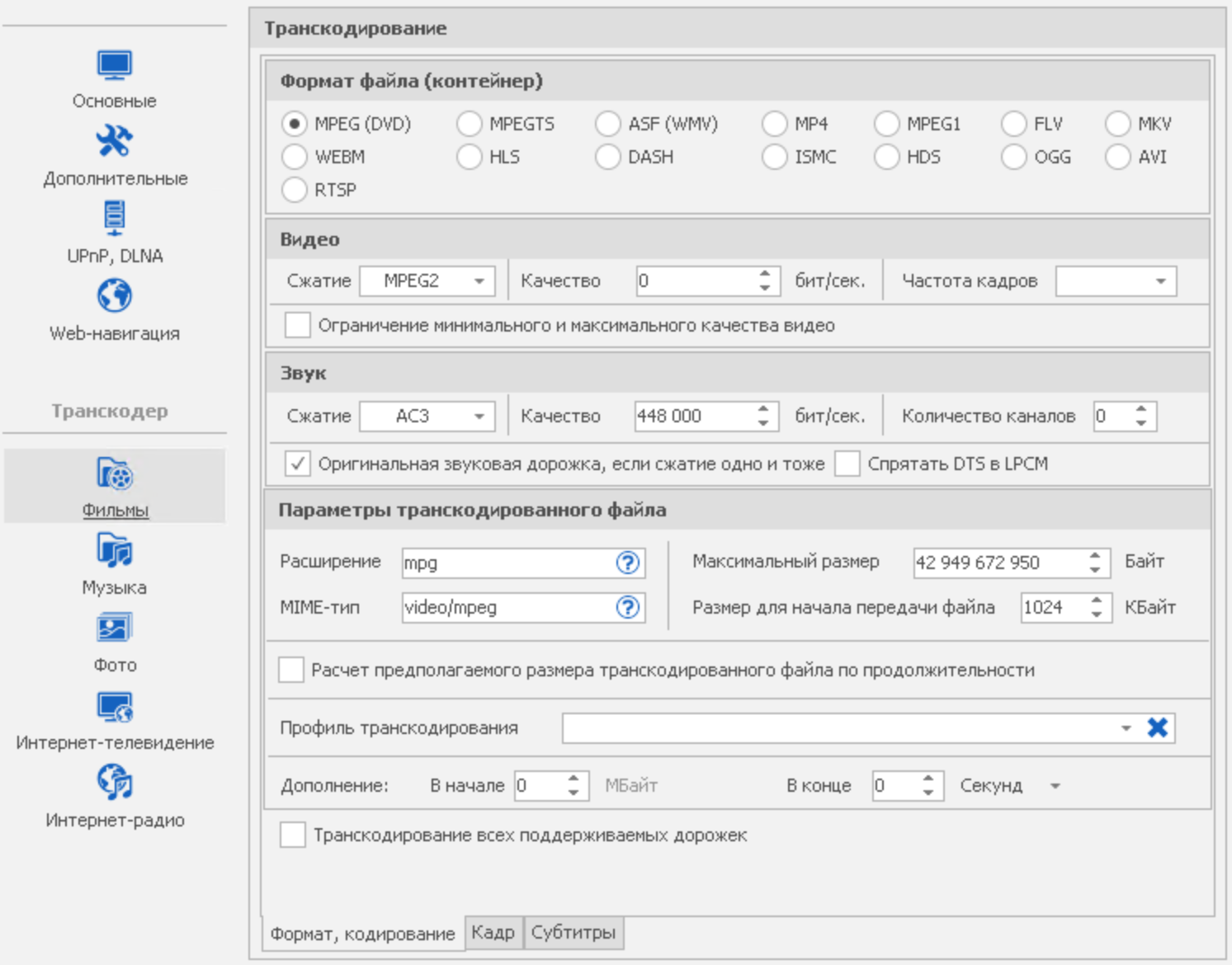 Проверил следующее - профиль транскодирования в каталоге не установлен. В настройках клиентского устройства (см. скриншот) точно установлены поддерживаемым и тип файла mkv и для него кодеки H264 и AC3. "Максимальное разрешение видео" установлено 1920х1080 FullHD. Более того, если бы транскодирование по этим настройкам потребовалось бы, то в настройках транскодирования для этого устройства указано расширение файла mpg, а в реальности генерируется m2ts.