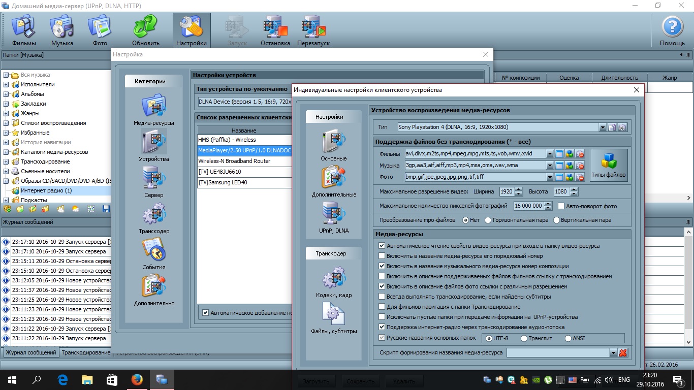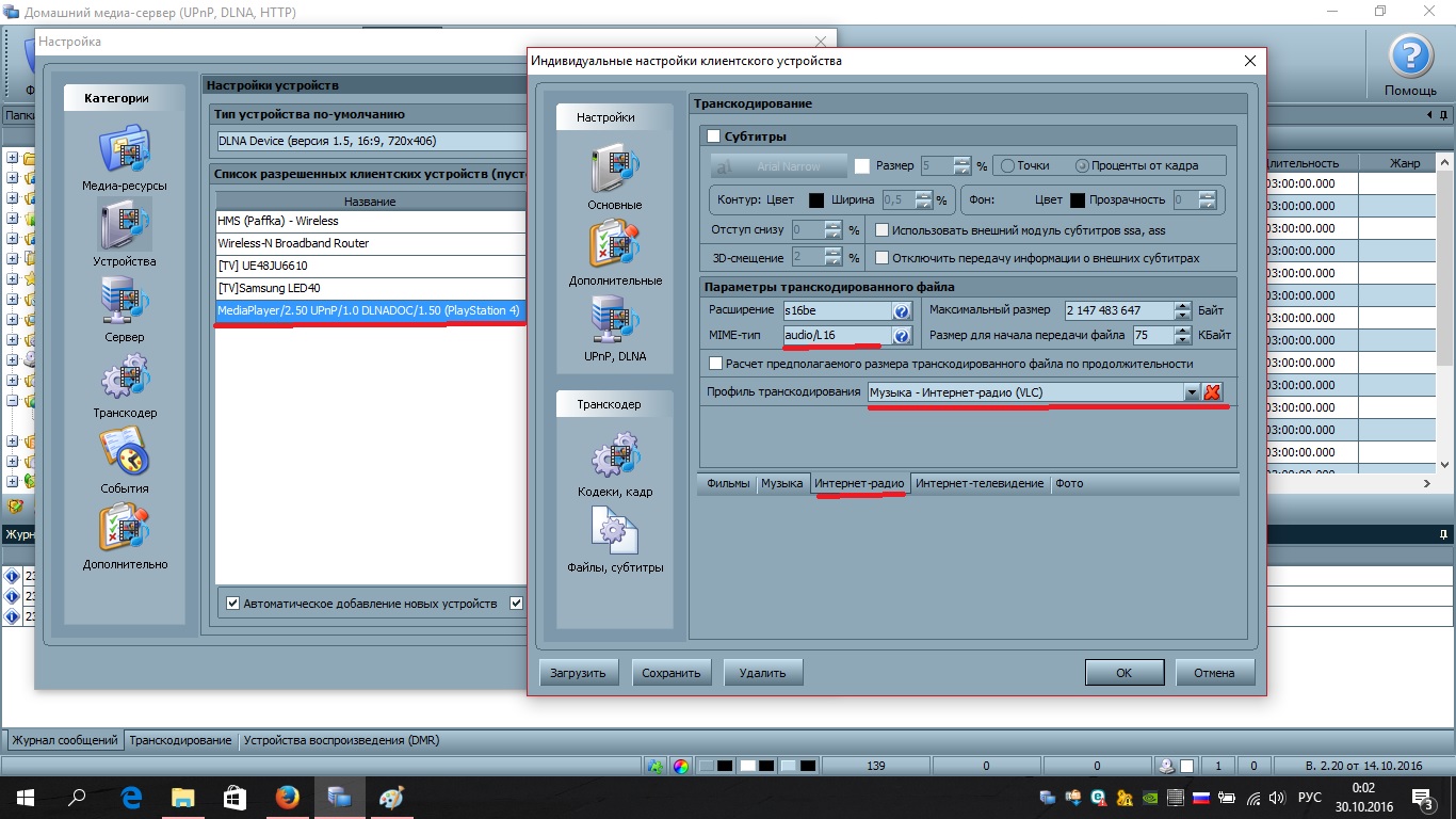 Нужна помощь в настройке прослушивания интернет радио на PS4. На PS4 имеется программа Медиа проигрыватель. При запуске сервера HMS программа на консоле видит видео и музыку. Вопрос в том как включить интернет радио. На старых версиях программы чисто случайно настроил программу и на PS4 интернет радио работало так: Запускал файлик интернет радио - он запускался, прогружался некоторое время затем можно было сворачивать медиа плеер и играть, Задержка от прямой трансляции была ~30 сек. Теперь после сноса программы HMS и переустановки ее на версию 2.20, не могу настроить на трансляцию. Вот хоть убейте не помню как настраивал (что-то вроде через транскодирование). Все работало и создавал несколько радио. Сейчас бы хоть одно заработало. Даже станции с Itunes не хотят запускаться с консоли.