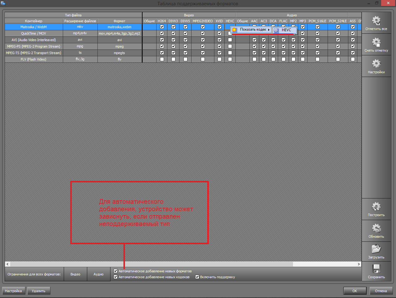 Пример опять же из настроек PS4 (контейнер (Matroska), расширение (MKV) и формат (matroska) и ищем пересечения с кодеками (видео (H.264/MPEG-4 AVC High Profile Level 4.2 (это в нашем случае MPEG2, просто сжатие разное) и аудио (MP3, AAC LC, AC-3 (Dolby Digital)) и выставляем галочки (6). И так по каждому формату, после выставления нажимаем ок и видим, что в графе фильмы остались только наши форматы, значит всё сделано правильно.
