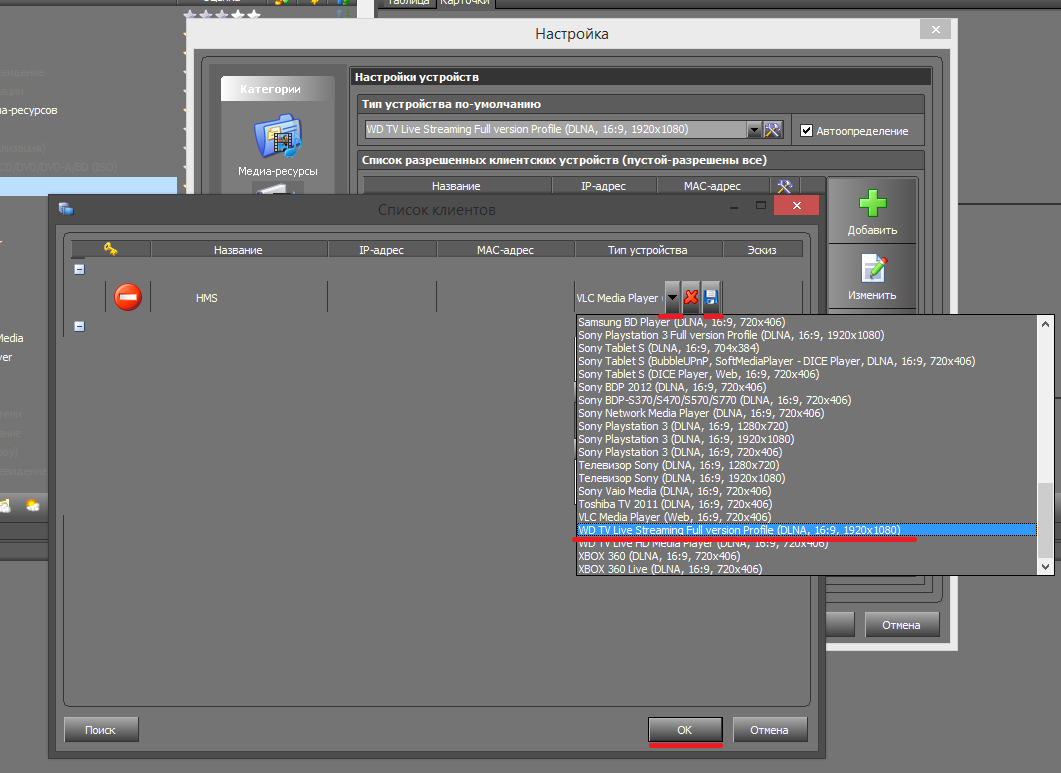 1. Выбираем тип вашего устройства из списка, если устройства нет, то выбираем самое близкое к вашему. Но бывают случаи, когда даже похожего устройства нет, как быть, в этом случае выбираем из списка стандартные устройства, но нужно определиться на какой версии DLNA работает ваше устройство 1.0 или 1.5 (ну если сведений вы не нашли, то аналогия такая 80% устройств выпуска после 2010, поддерживают 1.5, но бывают исключения) и дальше выбираем профиль "DLNA Device (версия 1.0 или 1.5, 16:9, 720x406)".